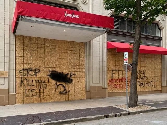 Demonstrations called for justice in the death of George Floyd which led to violence and destruction in Dallas over the weekend. Many store front windows were smashed and some businesses were looted. With the possibility of more protests throughout the week, some businesses are boarded up to prevent further damage.
