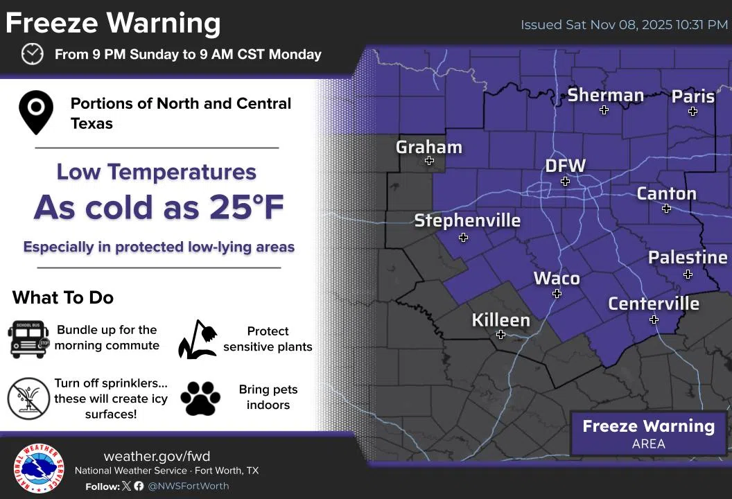 The first arctic blast is comingA freeze warning has now been issues for a large swath of North Texas and portions of Central Texas for Sunday night into Monday morning. Temperatures will dip down int...