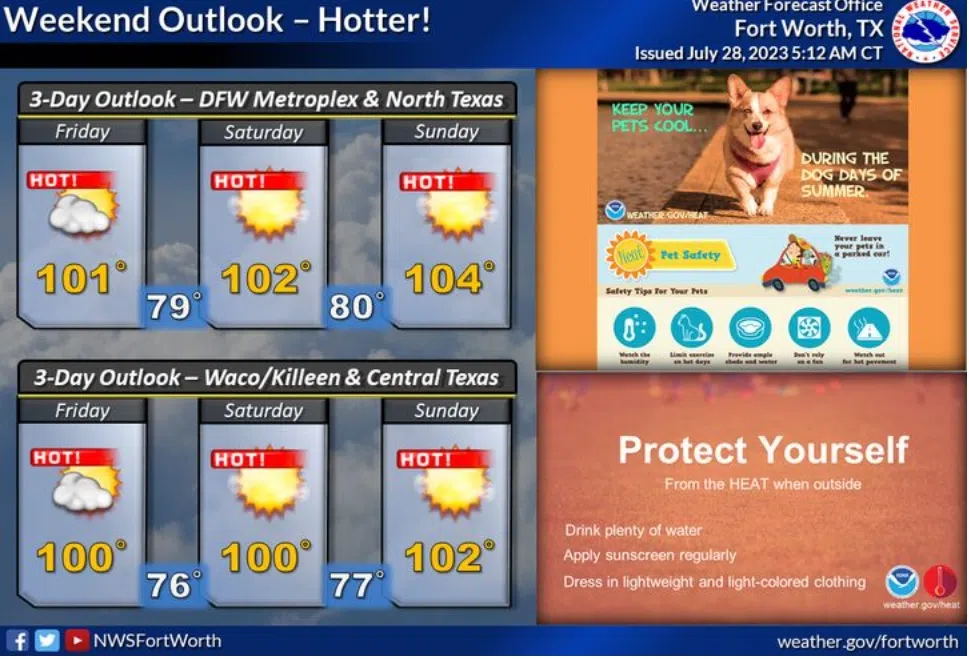 (National Weather Service-Fort Worth)Hot and dry conditions persist with max heat index values generally in the triple digits. The Heat Advisory remains in effect until 9 PM Wednesday.WednesdaySunny a...