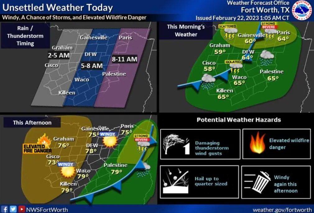 (National Weather Service-Fort Worth)A complex of storms will move into eastern North Texas this morning and continue ESE throughout the day. Additional isolated to scattered storms may develop furthe...