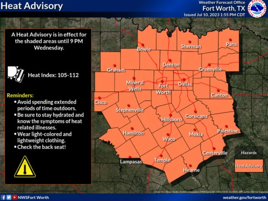 (National Weather Service-Fort Worth)Make sure to practice heat safety by drinking plenty of water and avoiding time outdoors. Know the signs of heat-related illnesses. Extreme heat and humidity will ...