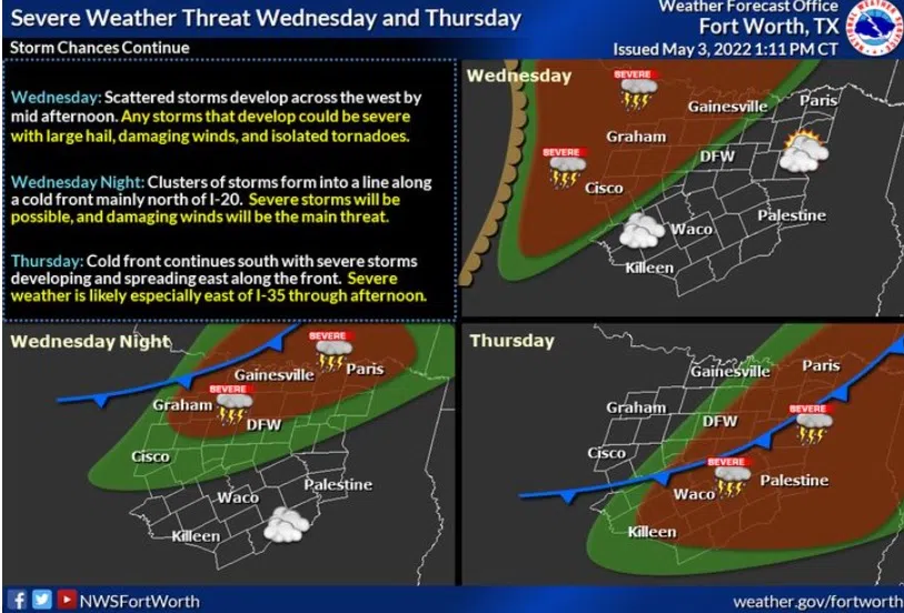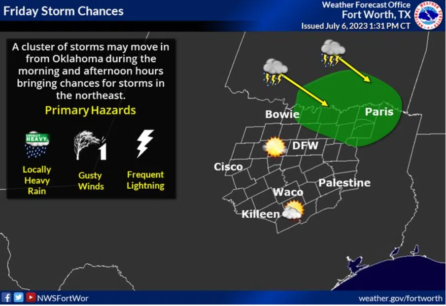 National Weather Service-Fort WorthA cluster of storms from Oklahoma may move into northeastern portions of North Texas during the morning and afternoon hours on Friday. Today: Sunny, with a high near...