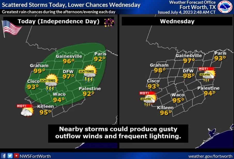 (National Weather Service-Fort Worth)Highs will be in the mid and upper 90s.Independence DayA 20 percent chance of showers and thunderstorms after 1pm. Mostly sunny, with a high near 96. Heat index va...